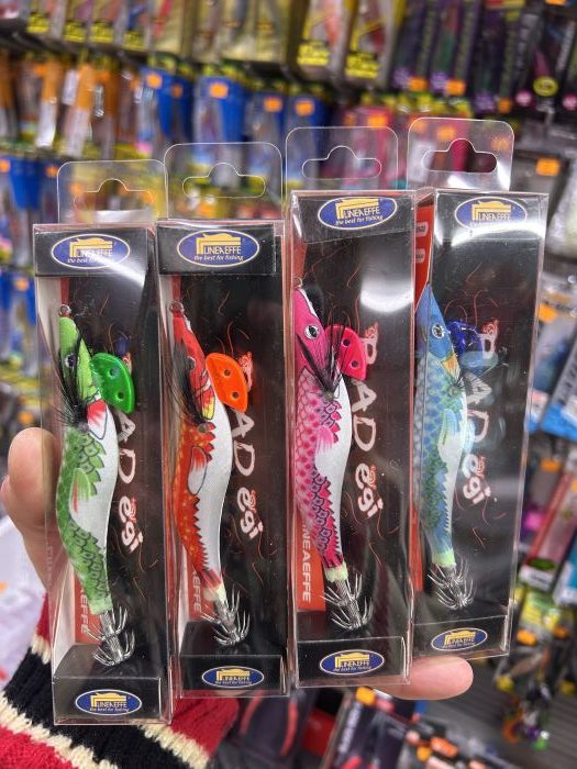 Caja de 10 señuelos para la sepia y calamar de la marca Lineaeffe , SERIE BAD EGI en tamaño 3.0 en surtidos de colores. Peso del señuelo 14 gramos y 9 cm de largo.