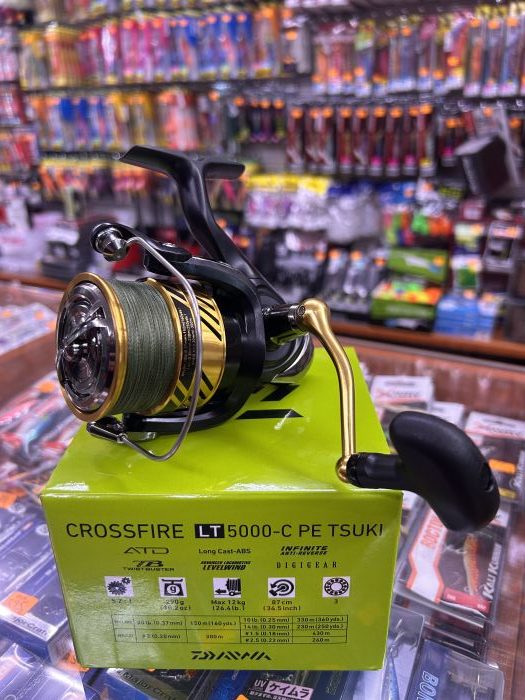 Carrete DAIWA 2023 CROSSFIRE LT 5000-C PE TSUKI especial para fondo medio y spinning . Modelo que viene con trenzado incluido en la bobina. Tiene 3 Rodamientos y una potencia de frenado de 12 Kg. Con un ratio de 5.2 y un peso de 290 gramos , se recomienda el uso de nylon de 0,30mm / 230 metros o trenzado de 0,22mm / 260 metros.