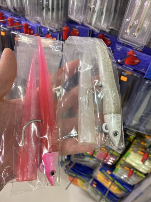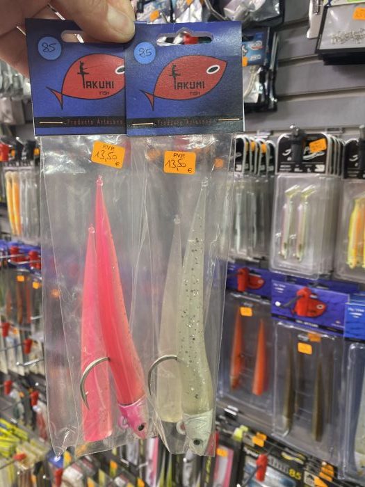Pack de 2 Señuelos TAKUMI FISH en 85 gramos. Cada señuelos incluye un montaje completo y un cuerpo de repuesto. Un señuelos es pink /rosa y el otro es snow glitter/ blanco brillos.