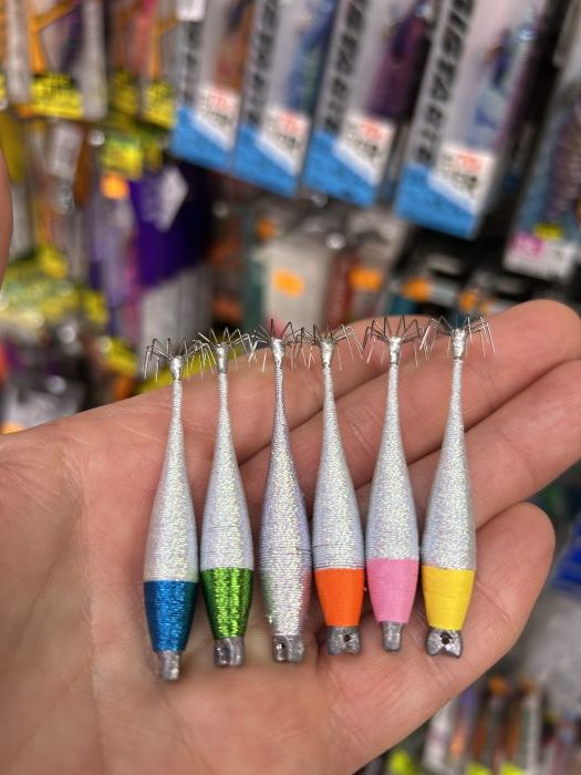 Pack de 6 poteras brillantes en surtido de colores del Nº 1 , 5,5 cm y 13/14 gramos. Estas aguadañas , aguarines, poteras.. se utilizan sobre todo para la pesca del calamar de verano desde embarcación con aparejos de mano.